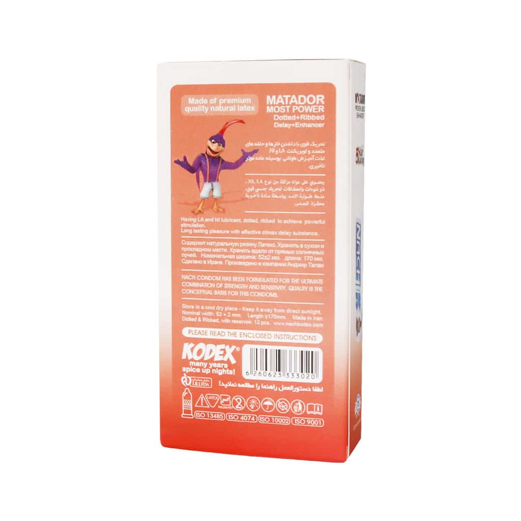کاندوم ماتادور کدکس از لاتکس کاملا طبیعی ساخته شده و با رایحه مطبوع موجب به یاد ماندنی شدن رابطه می‌شود. برند ناچ کدکس تنها برندی کاندومی است که محصولات خود را از لاتکس 100 درصد طبیعی تولید می‌کند. در نتیجه کاملا ضد حسایت بوده و هیچ نوع ماده پلاستیکی در آن استفاده نشده است. به علاوه این نوع ماده خاصیت ارتجاعی فوق‌العاده‌ای داشته و در واژن جا نمی‌ماند یا پاره نمی‌شود. شما می‌توانید برای خرید محصولات جنسی و مشاهده قیمت آن‌ها به دسته بندی مربوطه در سایت مثبت سبز مراجعه کنید.